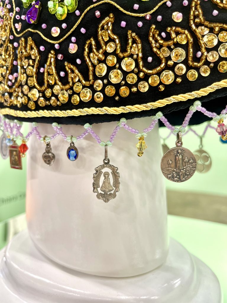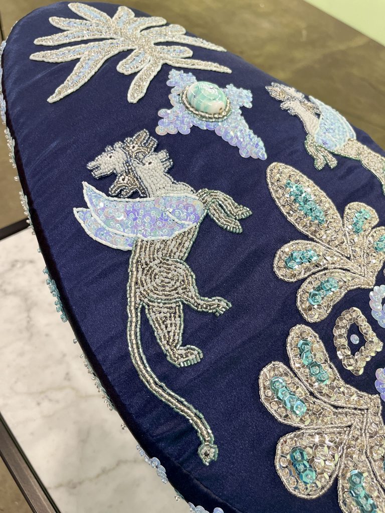 Rademakers Gallery will be at PAD Paris exhibiting for the first time a very special work: Show Me That You Care. Here Jorge Mañes Rubio takes the traditional Andalusian chair to new heights, transforming it into a mythical throne. This unique piece has been decorated with a multitude of intriguing creatures and symbols. The chair has its own feet, as if proclaiming its own nature. Beaded on the backrest, a delicious melon has been split open, reminiscing of a waning crescent moon, while a pair of eyes watch us attentively. On the back, a human face with golden eyes and tongue, framed in a powerful aura, delivers what could be a sacred message, their hands embracing a mystical force. The chair’s seat imitates the traditional Andalusian rope bottoms, but using a rich arrangement of glass beads in color-block patterns instead.