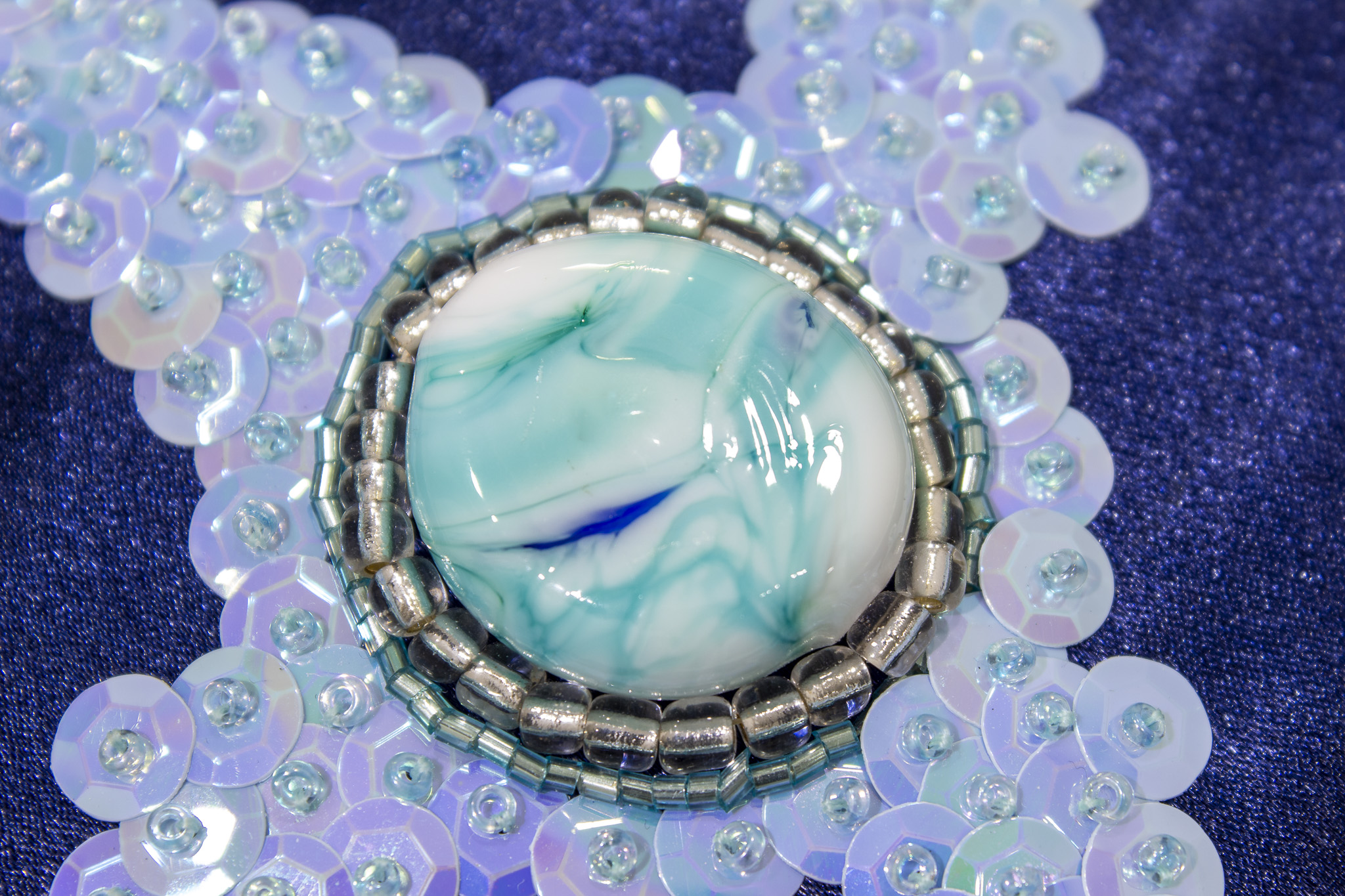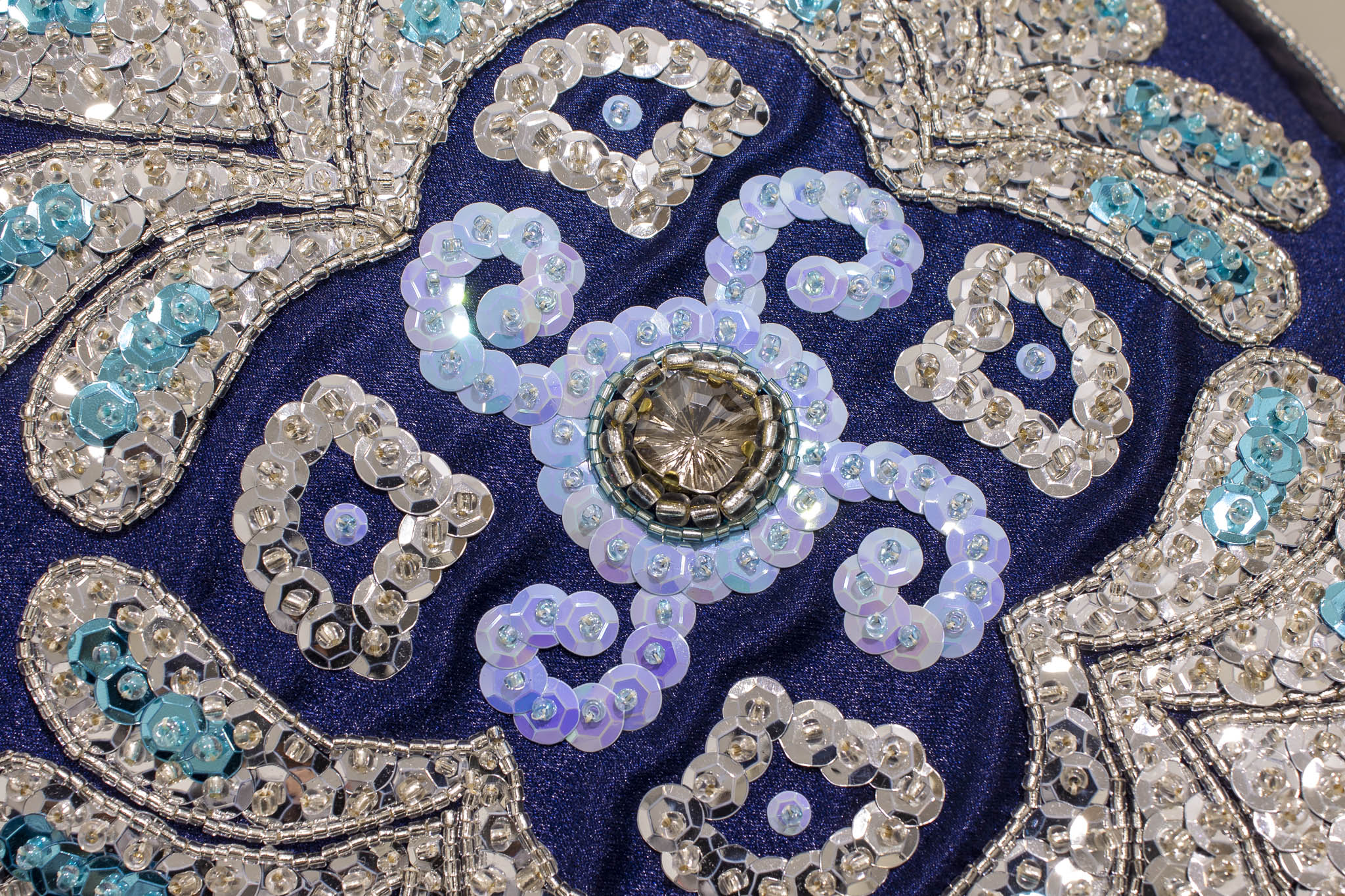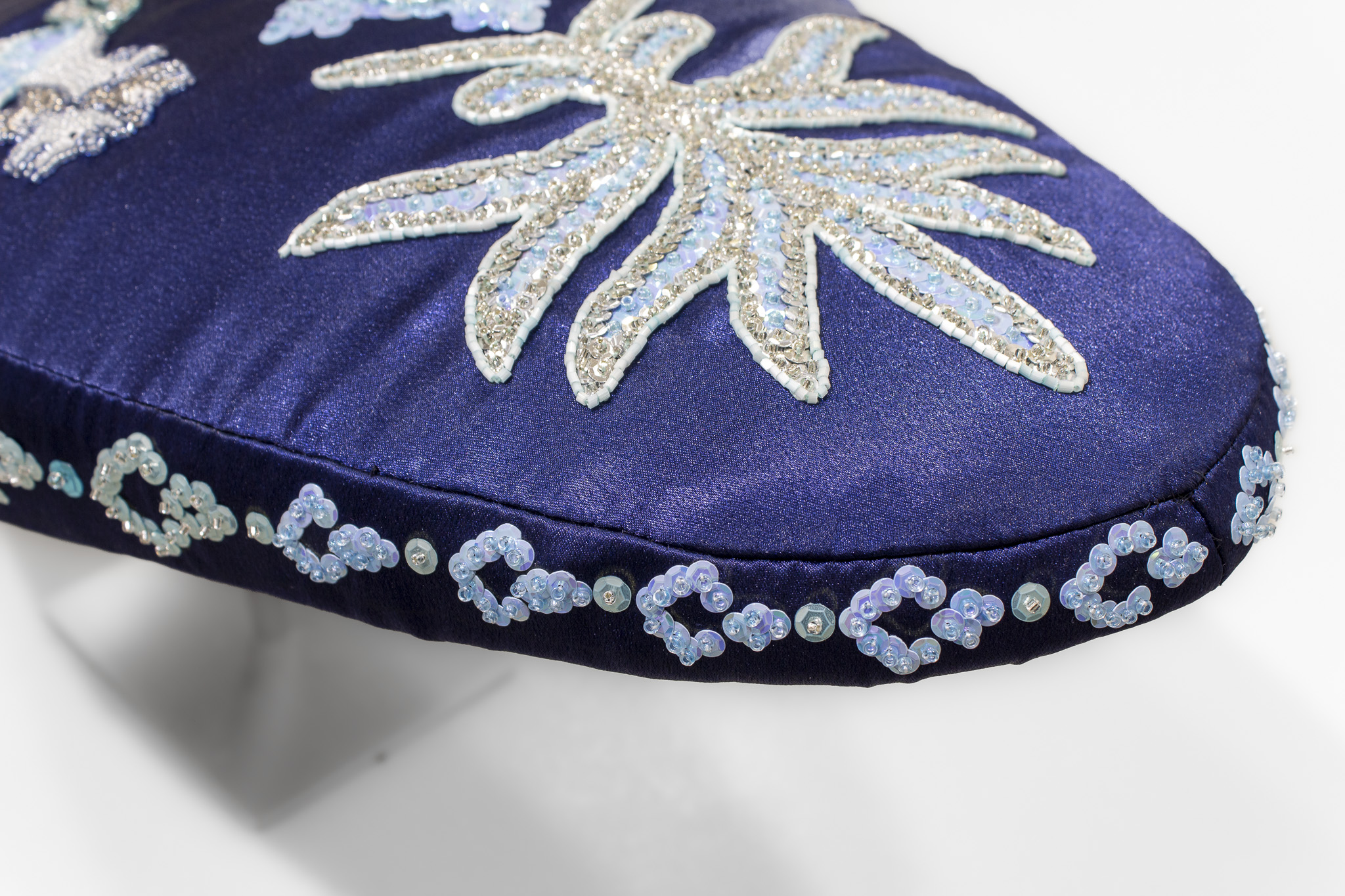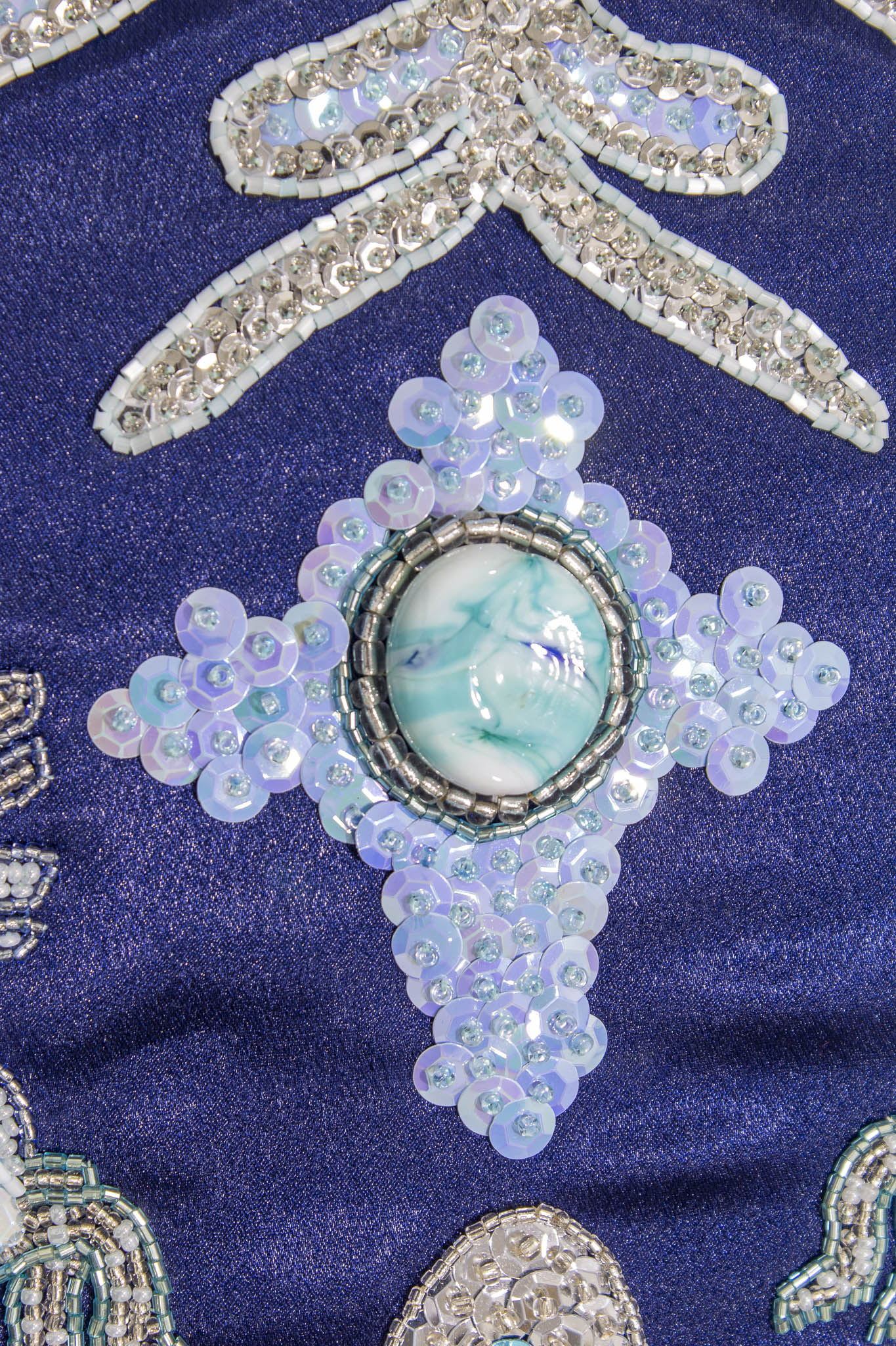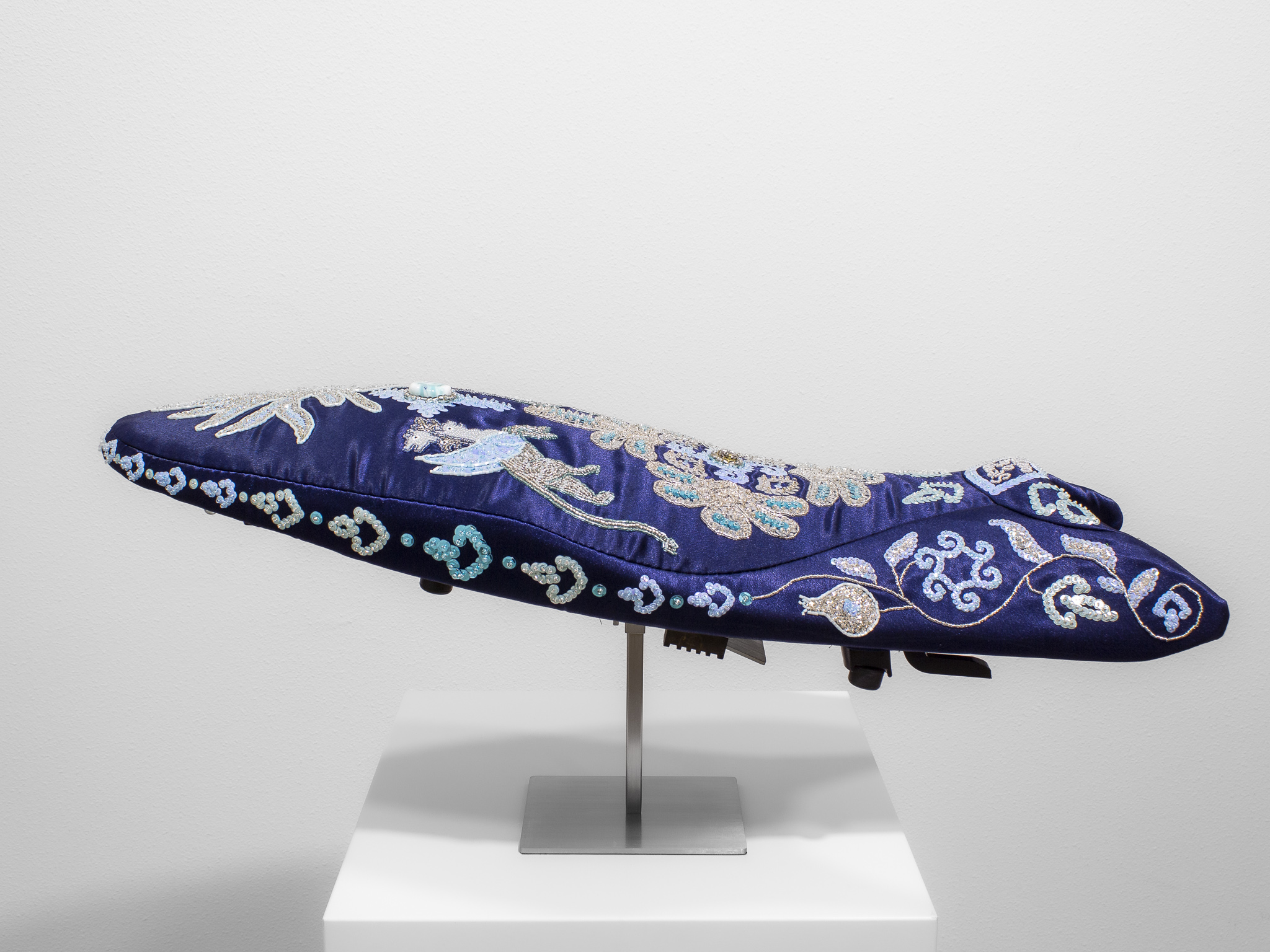 The work’s title references an intimate space echoed through a constellation of motifs that unfold across its deep blue surface. Influenced by religious embroidery rooted in the artist’s own Catholic background, the composition features a central cross anchored by a handmade glass bead produced by the artist in Venice, surrounded by four-headed creatures, garlands, branches, flowers, spirals, and a prominent tree of life. These elements come from a wide personal visual archive, ranging from medieval manuscripts and Byzantine mosaics to Spanish traditional costumes, including the 1865 Traje de Charra from the Infanta Isabel encountered at the Museo del Traje in Madrid.