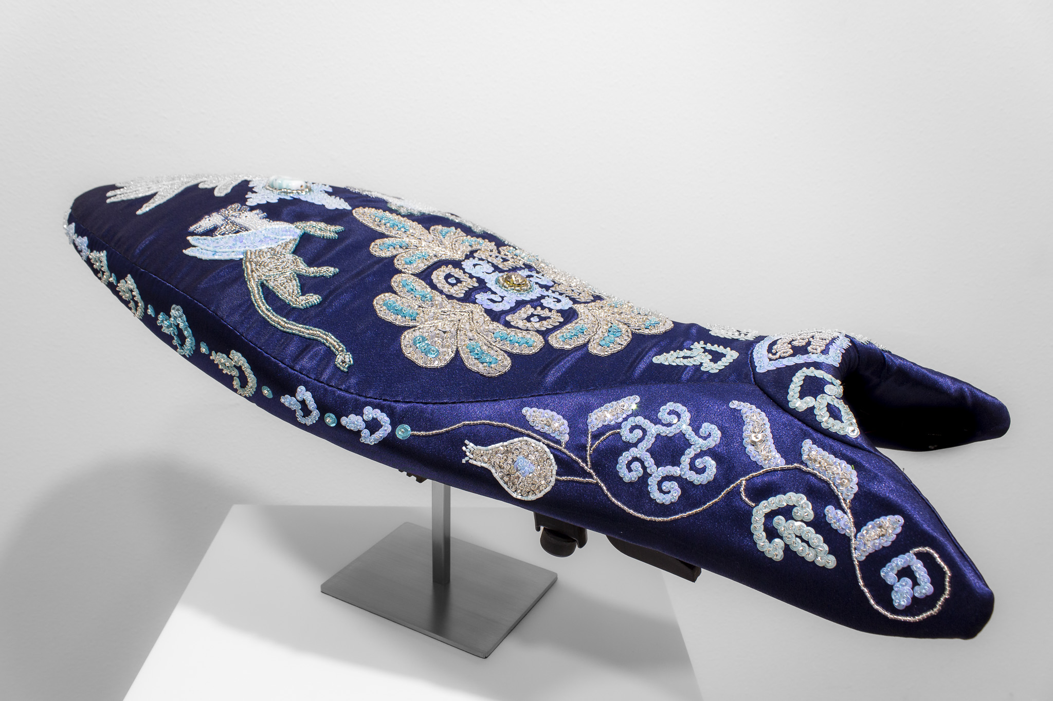 Siempre a tu Arrimo confirms the artist’s ongoing exploration of textile formats and techniques, merging them into his distinctive sculptural sensibility. A Suzuki Gladius SFV650 motorcycle seat serves as an unexpected canvas where symbols of protection, devotion and love are gracefully materialized through glass beads and sequins.